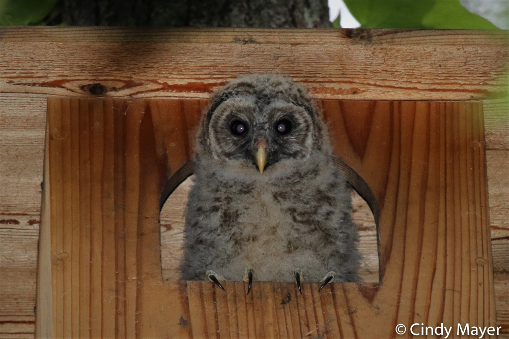 “I’ve been watching & listening for any evidence of an owlet for the past few weeks since I saw activity in the in the nest box. This afternoon I saw what looked like an owl’s tail sticking out of the doorway of the nest box, so I ran downstairs to grab the camera & headed outside. And when I got there, I saw two big eyes & a ball of fluff sitting in the doorway, & talons, too — silently staring at me! How exciting!! ”