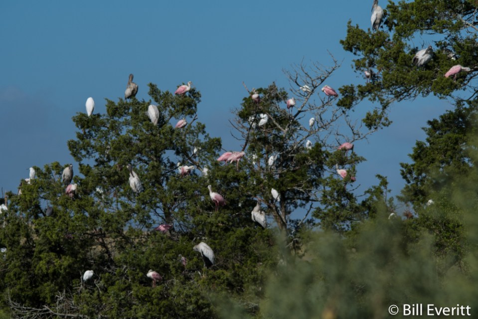 Wood Storks and Roseate Spoonbills near the toll booth