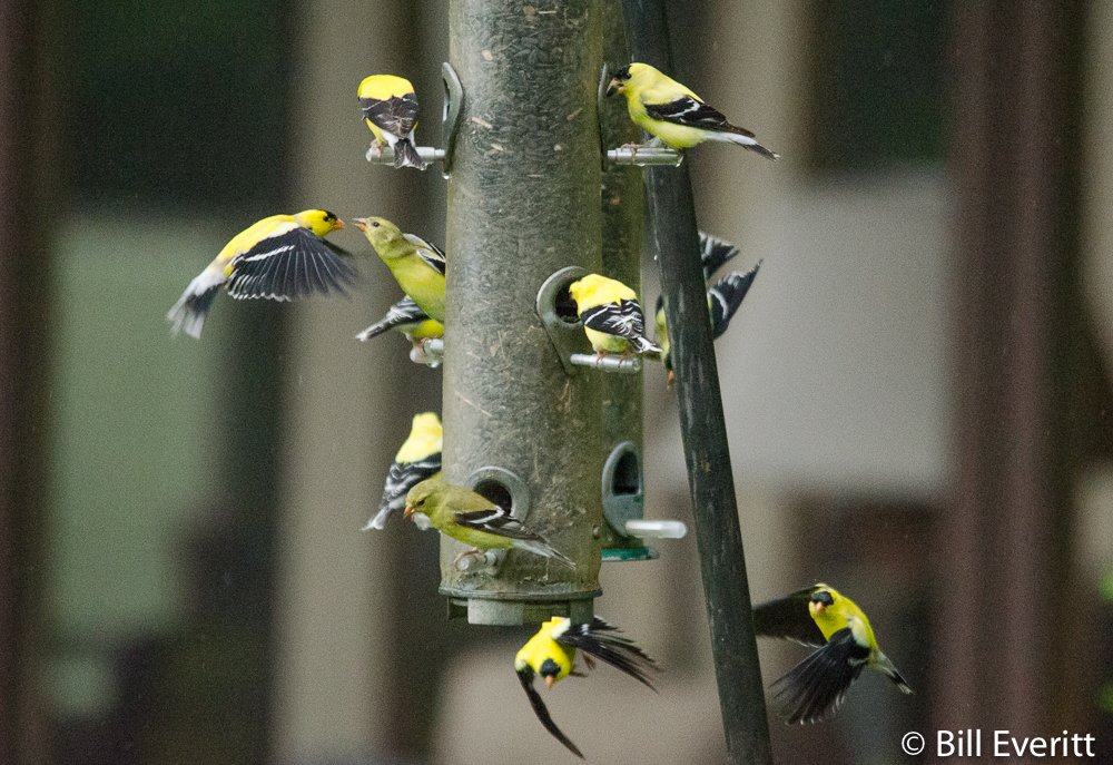 Goldfinches are migratory, but can be found here in Georgia at feeders all year long. They will sometimes descend in flocks in the spring and fill the trees and shrubs with their chatter. They will mob a bird feeder, preferring nyjer (thistle) and sunflower seed. [2][3]