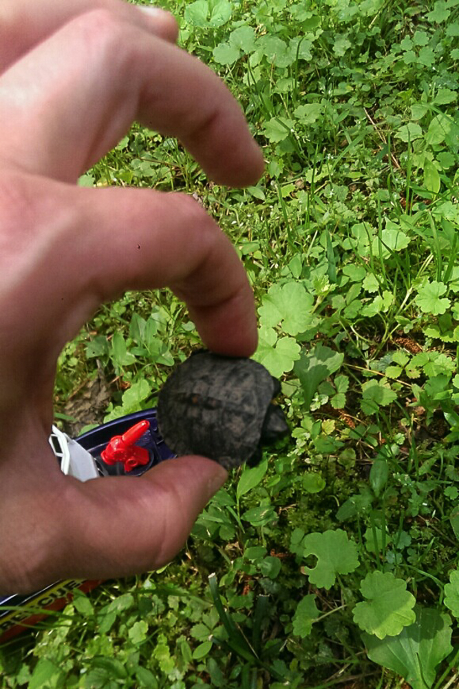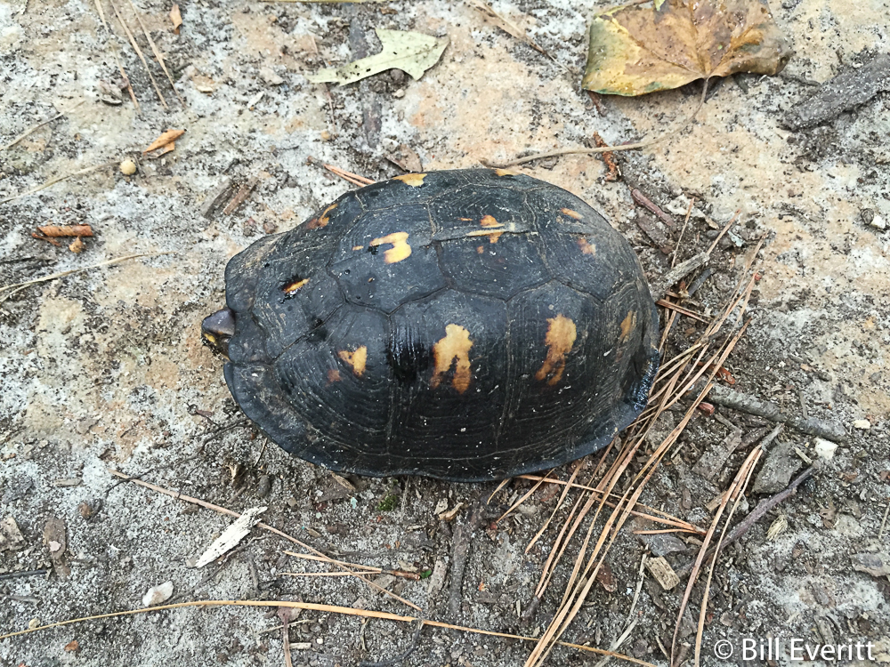 Turns out that now is a good time to spot box turtles since it’s nesting season. Females nest from May through July laying 1 to 2 clutches of 5 eggs each. Most hatchlings emerge from the nest in the fall. Hatchlings are very secretive and are seldom seen until they are 2 or 3 years old. [1]