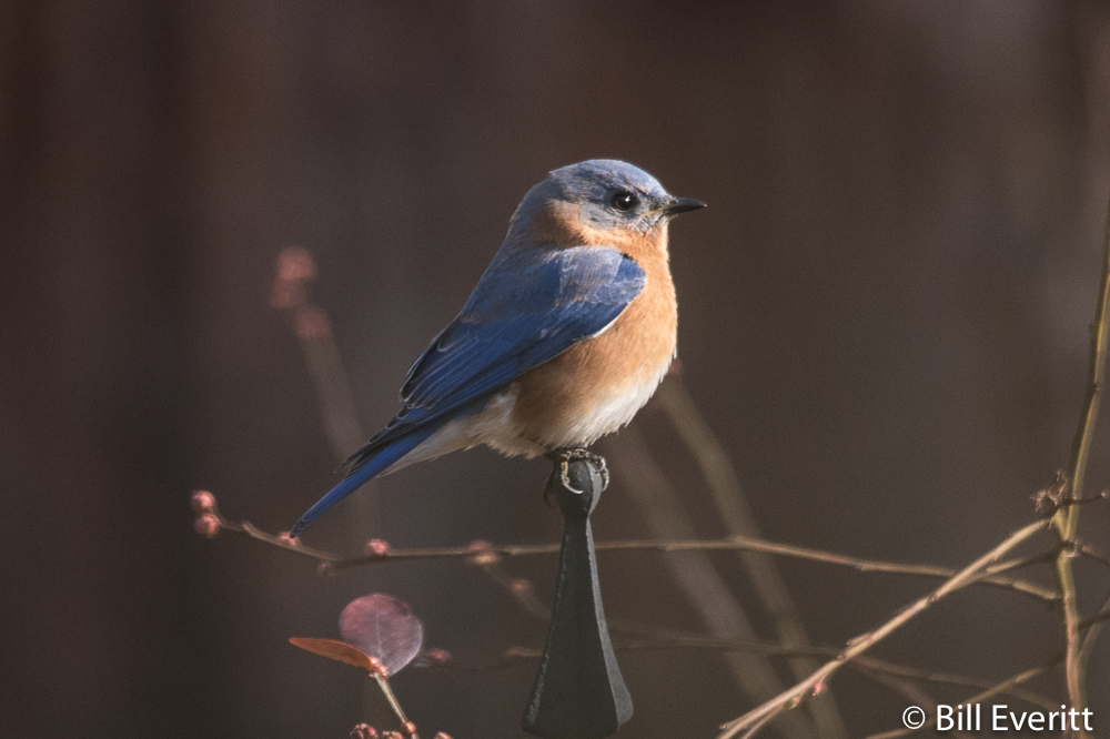 “Male Eastern Bluebirds are vivid, deep blue above and rusty or brick-red on the throat and breast. Blue in birds always depends on the light, and males often look plain gray-brown from a distance. Females are grayish above with bluish wings and tail, and a subdued orange-brown breast.” [1]