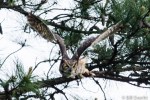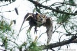 This owl is also known as the ‘Hoot Owl’ and the ‘Tiger Owl’, a name derived from early naturalists’ description as the ‘winged tiger’ or ‘tiger of the air’. [1] If you see one coming straight at you with it’s enormous wing span (3 to 5 feet) and giant claws, tiger of the air seems most appropriate. Just look at the sequence of photos above of this Great Horned Owl leaving the pine after the crow episode.