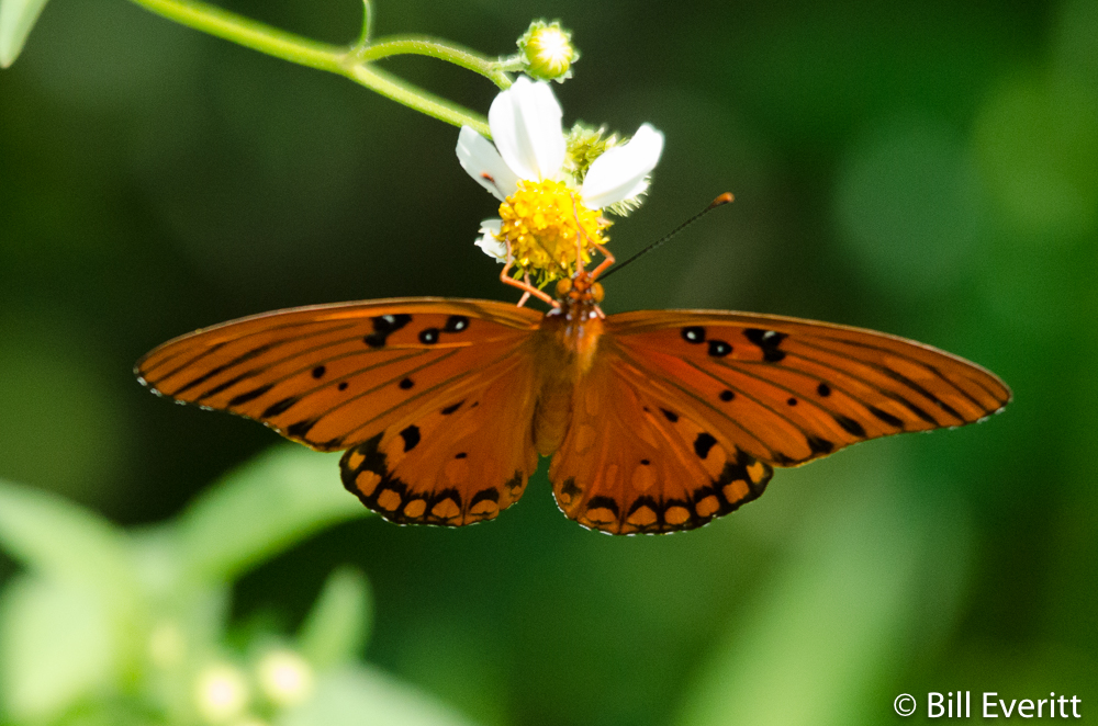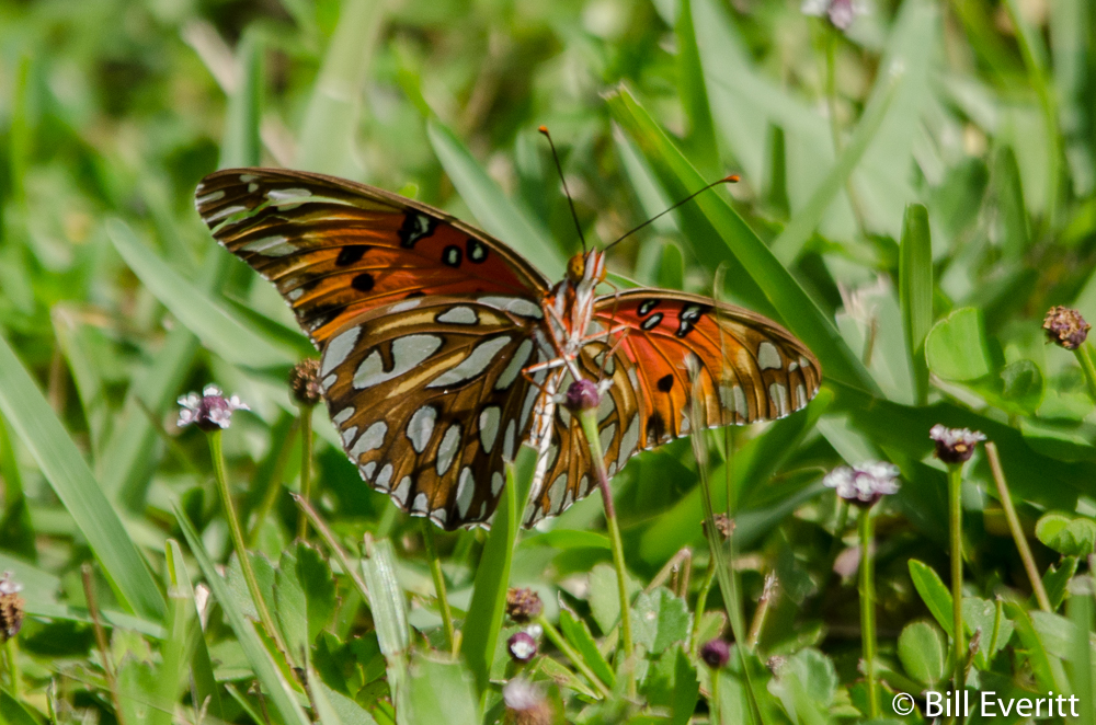 ‘Gulf ‘ refers to the fact that these butterflies migrate over the Gulf of Mexico. [2] Fritillary comes from a Latin word, fritillus, which means chessboard or dice box. [1] Another name for these handsome butterflies is silverspots because of the metallic markings on their wings undersides. It is possible that this pattern, similar to a leopard’s spots, serves as camouflage when they are resting in places of dappled sun and shade spots. [1]