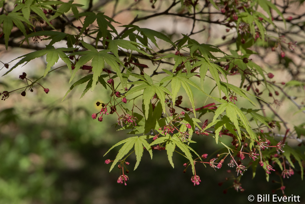 A Japanese Maple may have multiple trunks joining close to the ground. It’s often shaped like a hemisphere (especially when younger) or takes on a dome-like form, especially when mature. The leaves are 4–12 cm long and wide with five, seven, or nine acutely pointed lobes. The flowers are produced in small clusters, the individual flowers with five red or purple sepals and five whitish petals. [1]