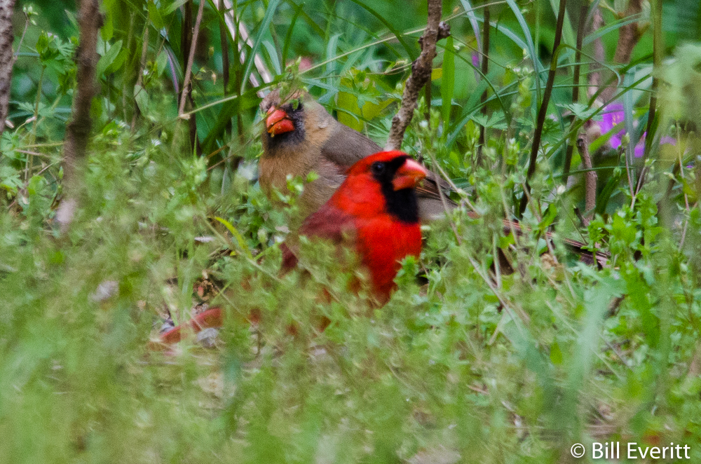 The Northern Cardinal will feed on insects and fruit, but mainly eats seeds and grains. During courtship, the male feeds seed to the female beak-to-beak. [1]