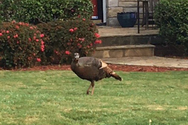 But today, a neighbor on the south side did get pictures of a wild turkey hen right in someone’s front yard. She was seen early this morning. We couldn’t find the bird ourselves, but we did talk to the neighbor who kindly sent us the pictures to share.