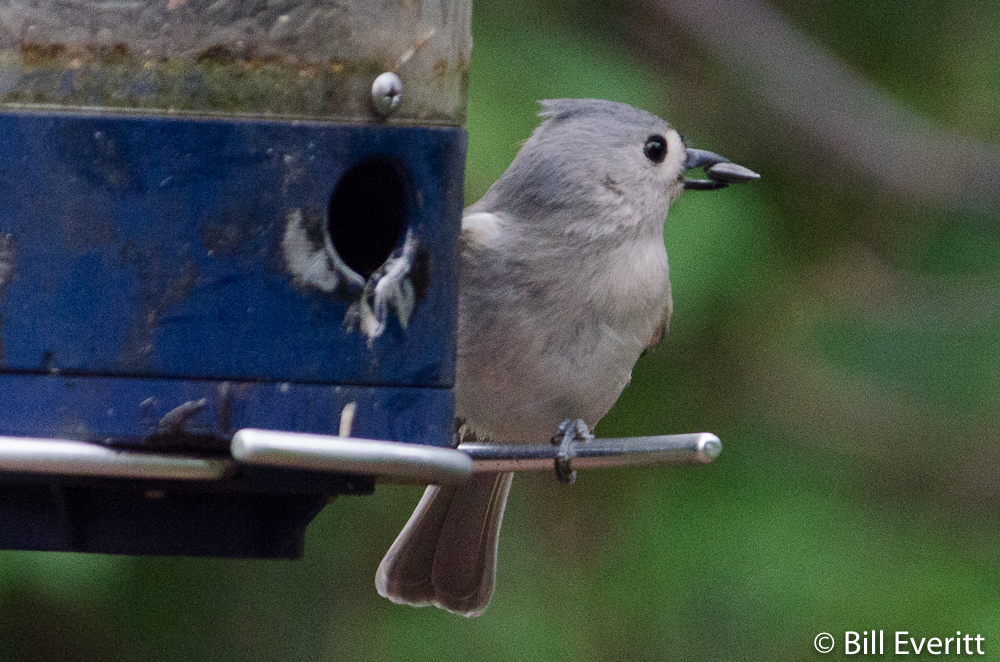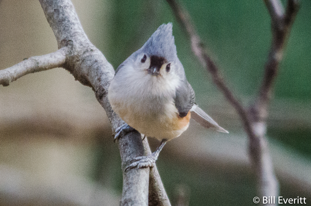 These birds have grey upper parts and white underparts with a white face, a grey crest, a dark forehead and a short stout bill; they have rufous-colored flanks. [1] A Tufted Titmouse is a beautiful bird and we don’t see them often enough. That’s partly because they move around a lot, seldom staying in one spot more than a few seconds, which also makes them a bit hard to photograph.